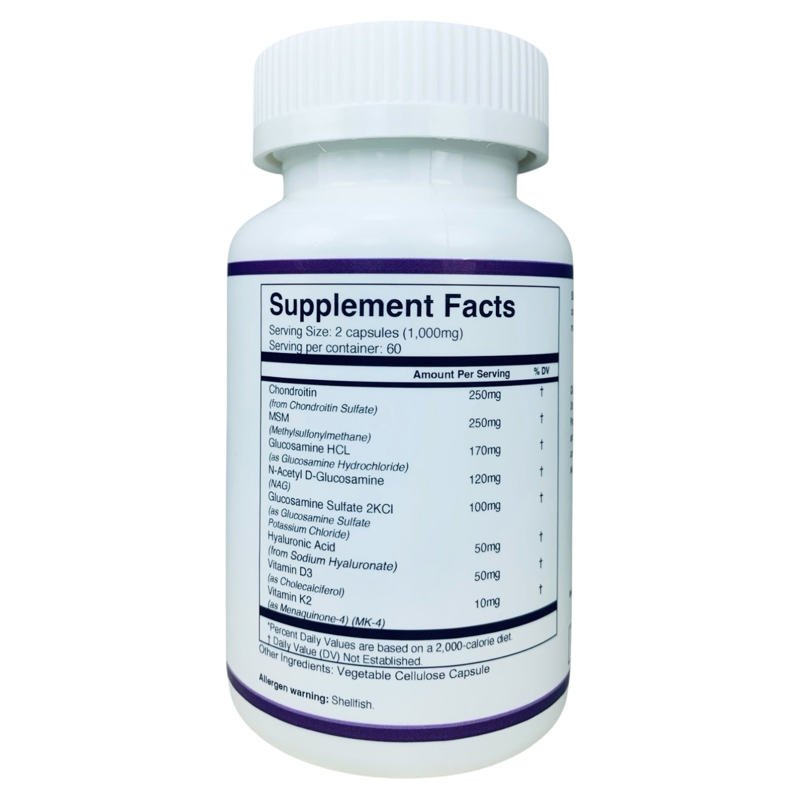 Give your joints the support they deserve with a powerful blend of Chondroitin Sulfate, MSM, Glucosamine HCL, N-Acetyl D-Glucosamine, Glucosamine Sulfate, Hyaluronic Acid, Vitamin D3, and K2. Formulated to promote flexibility, cushion joints, and support the strength and integrity of connective tissues.