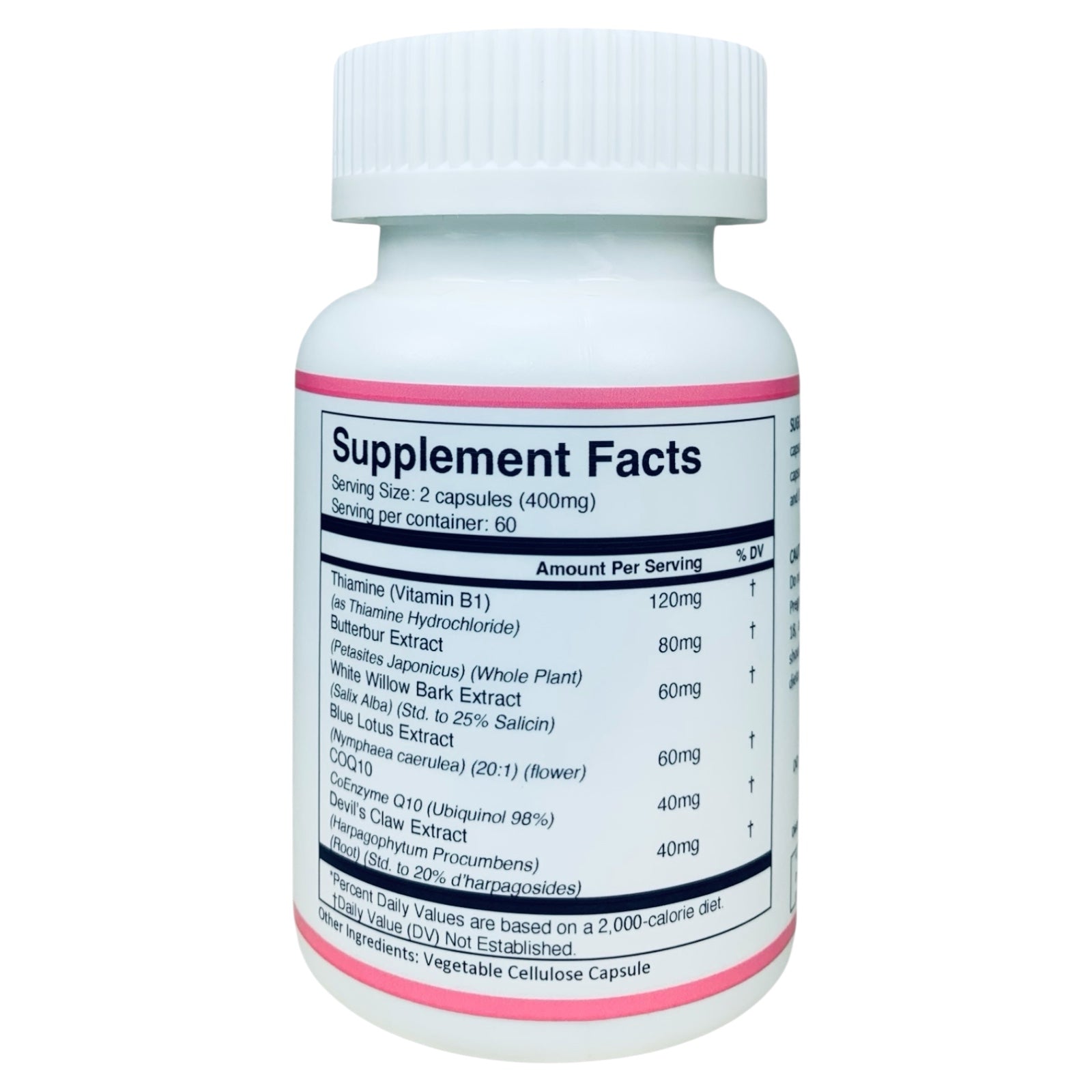 Find your calm with a targeted blend of natural ingredients known to support head comfort and neurological balance. Our formula combines Thiamine, Butterbur, White Willow Bark, Blue Lotus, CoQ10, and Devil’s Claw to help: