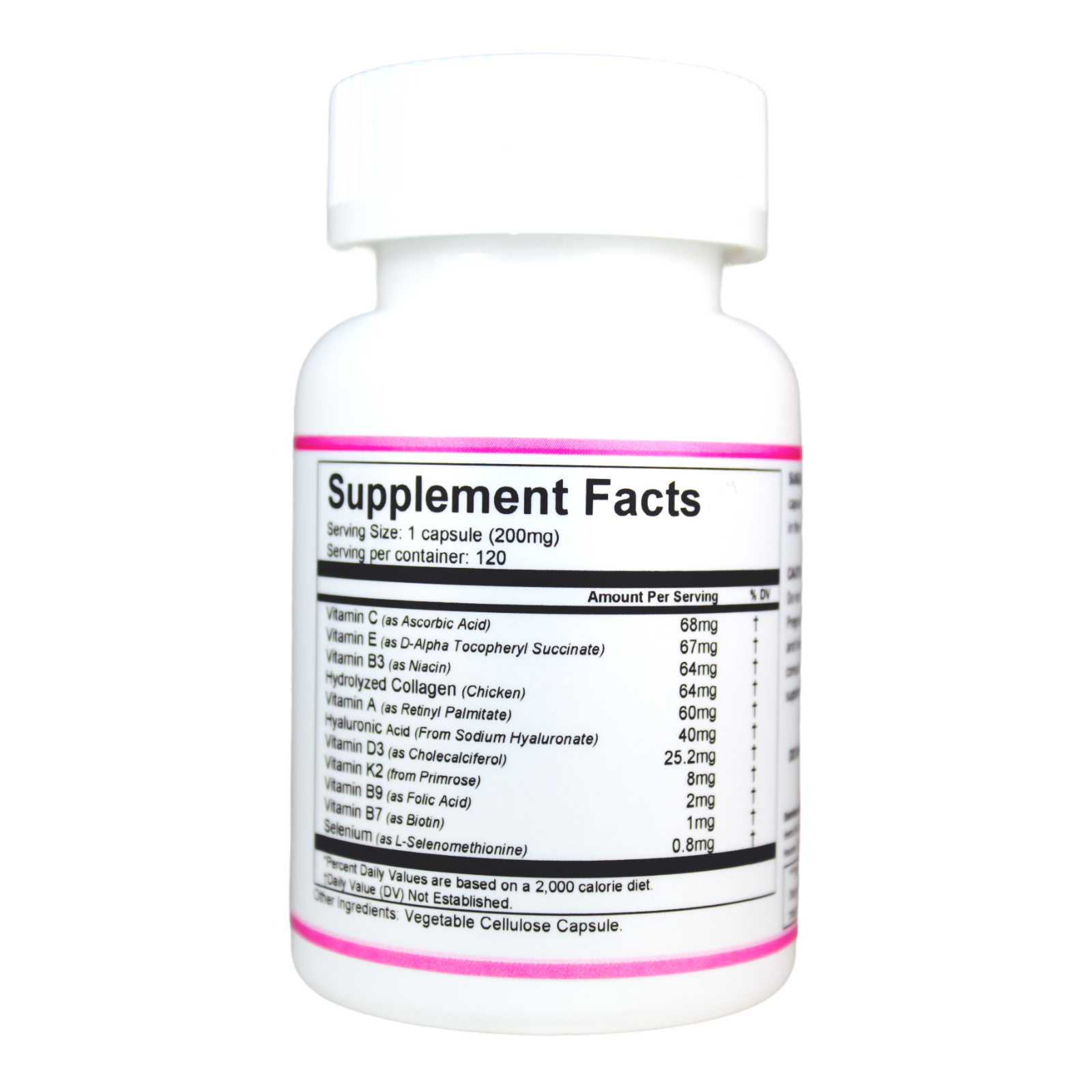 Reveal radiant, healthy-looking skin with a powerful beauty blend that works from the inside out. Formulated with Vitamins C, E, B3, A, D3, K2, B9, B7 (Biotin), Selenium, Hydrolyzed Collagen, and Hyaluronic Acid, this advanced formula supports skin elasticity, hydration, and a youthful glow.
